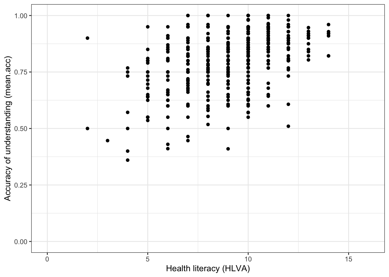 HLVA) and accuracy of understanding (mean.acc) varies. - We are considering the possibility that the the association between health literacy (
