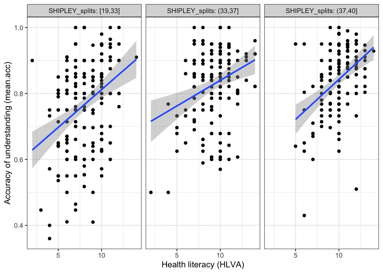 For example, let’s suppose that we want to examine the possibility that the effect of health literacy (HLVA) on accuracy understanding (mean.acc) is different for different values of vocabulary knowledge (SHIPLEY).
