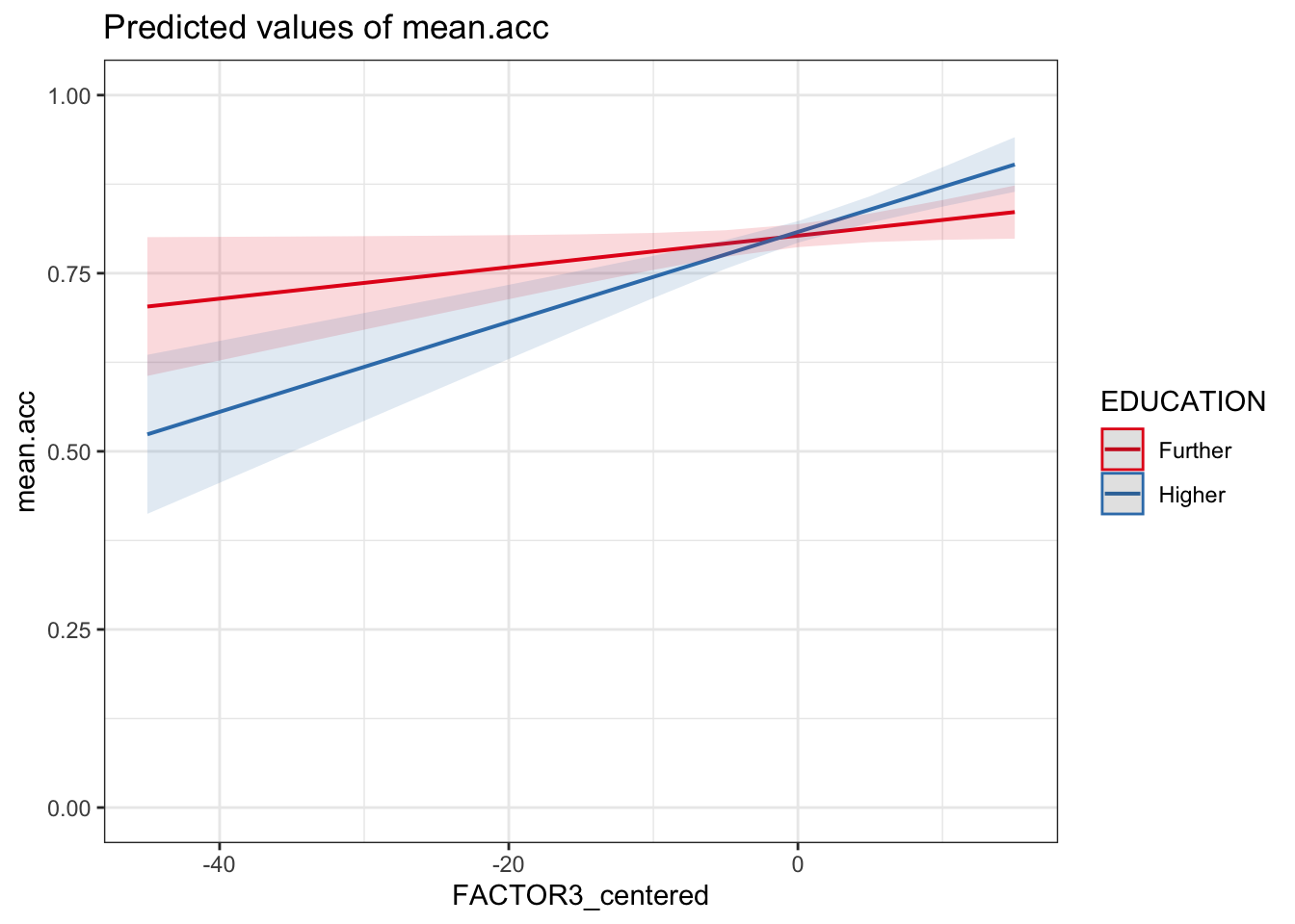 FACTOR3_centered:EDUCATIONHigher– this is the interaction, and reflects the change in the effect ofFACTOR3_centeredon outcomemean.acc, given different values ofEDUCATION, here, whenEDUCATIONisHigherinstead ofFurther.